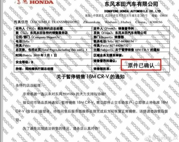 《关于暂停销售18M CR-V的通知》:接到公司市场品质科通知,暂停销售 18M CR-V,需立即停止交车给客户,立即禁止将在库 18M CR-V(含在途)做登录,待我司售后服务部维修处理完成后方可恢复正常销售。为避免出现违法销售的情况,请各店认真对待!