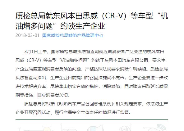 同样,国家质检总局就东风本田CR-V等车型“机油增多问题”约谈生产企业,召回措施尚不完善,生产企业要进一步改进技术解决方案,尽快拿出切实有效的措施,消除缺陷,并建议延长质保。