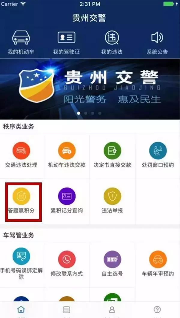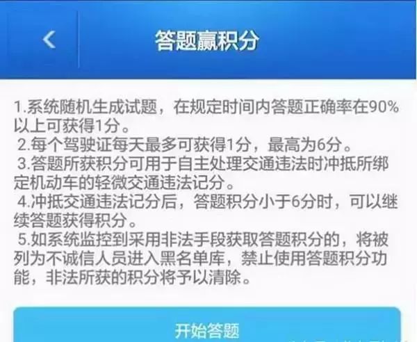部分地区的交警部门推出了答题赢积分系统,比如贵州的车主,只要下载一个贵州交警APP。系统会随机出10道交通知识试题,车主只要在5分钟内答对9道以上就可以获得1分,每天只能获得1分,但一个记分周期最多获得6分,可以用于抵用所绑定机动车的轻微交通违法记分。