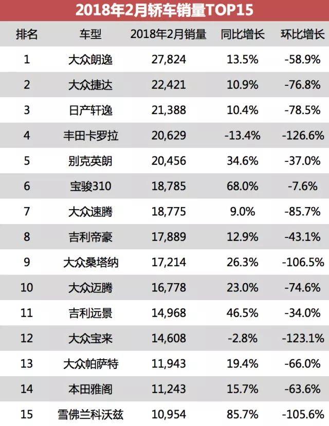 昨天的SUV销量排行榜一出炉,就让我们许多轿车的车主按耐不住,小编赶紧把2月轿车排行榜补上(传送门:SUV排行榜,终于被干掉了)。在轿车领域,2月份销售68.3万辆,同比增长1.3%,可以说销量明显有了抬头。2月份一汽大众和上汽大众销量分别为121,595台和121,135台,即使是在有春节长假的二月份,大众车每分钟也能卖出6台车。下面我们一起来看2月份轿车的前十车型吧。