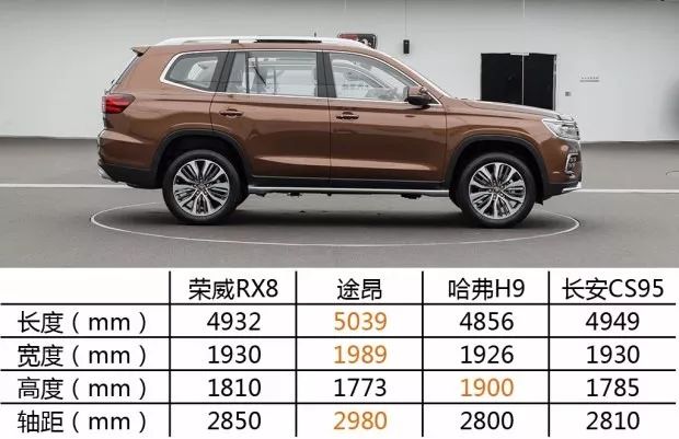 车身尺寸方面,荣威RX8的车身尺寸长宽高分别为4923/1930/1810mm(带行李架高为1840mm),轴距为2850mm,定位于中大型SUV,提供5座/7座版车型可选。与同为中大型SUV,如途昂、长安cs95、哈弗h9相比,并谈不上有优势。