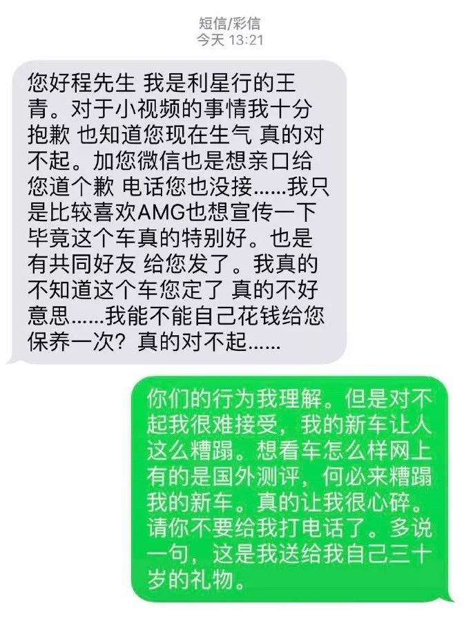 一位疑当事4s店工作人员向车主发来短信表示歉意,说到仅仅是比较喜欢AMG也想宣传一下,承诺以赠送一次保养作为补偿。