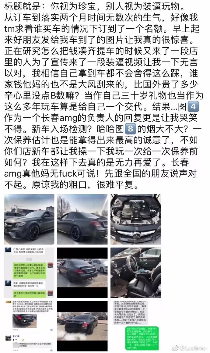 还未提车的车主知道此事后非常愤怒,在朋友圈中表达对4s店的不满,写下标题为“你视为珍宝,别人视为装逼玩物”一文,气到直接爆粗。