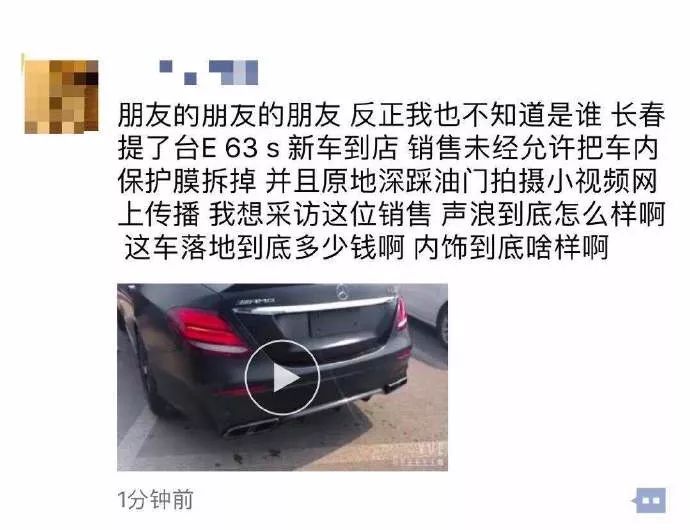 在与4s店销售沟通中,明确表示4S店里只有一台AMG E63S,4S店也确认被“原地轰油门”的正是客户的车。出现如此一幕,被告知竟然是“销售顾问没见过这个车,就想打火看看”。