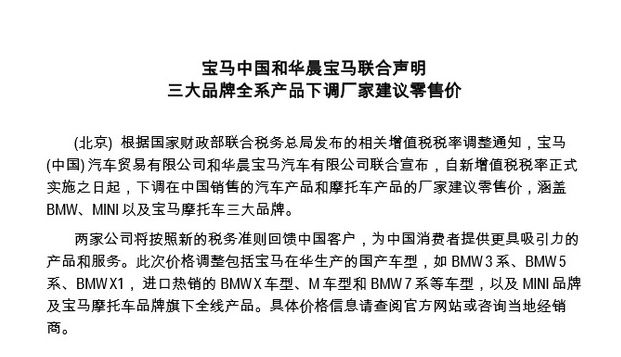 5月2日,宝马 (中国) 汽车贸易有限公司和华晨宝马汽车有限公司联合宣布,自新增值税税率正式实施之日起,全面下调在中国所销售的汽车产品和摩托车产品的厂家建议零售价。