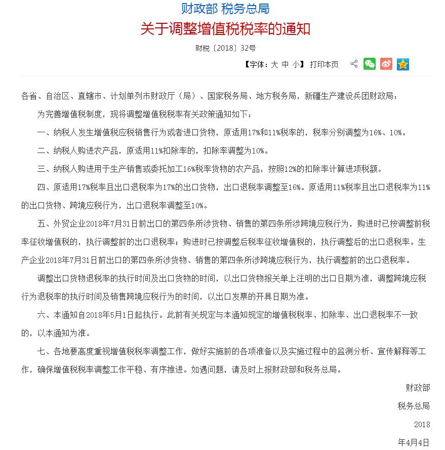 2018年5月1日起,财政部和税务总局联合下发了《下调增值税税率的通知》,将制造业等行业增值税税率从17%降至16%。