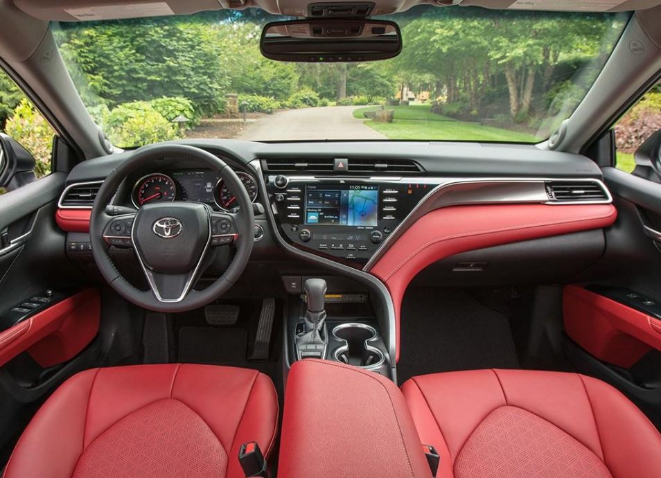 丰田凯美瑞的上榜是因为它红色的内饰加上黑色以及银色以及那不规则造型中控台设计,当然还有高清中控屏以及充满科技感的抬头显示系统。