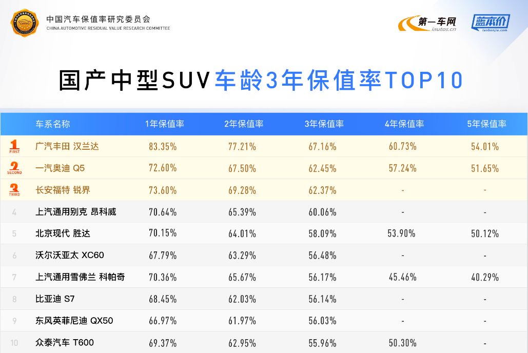 汉兰达坚挺的新车价格和良好的用户口碑,使其保值率长期高居首位。
