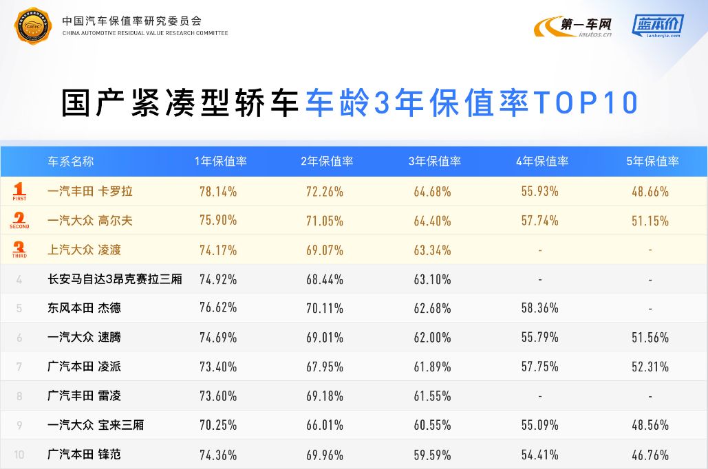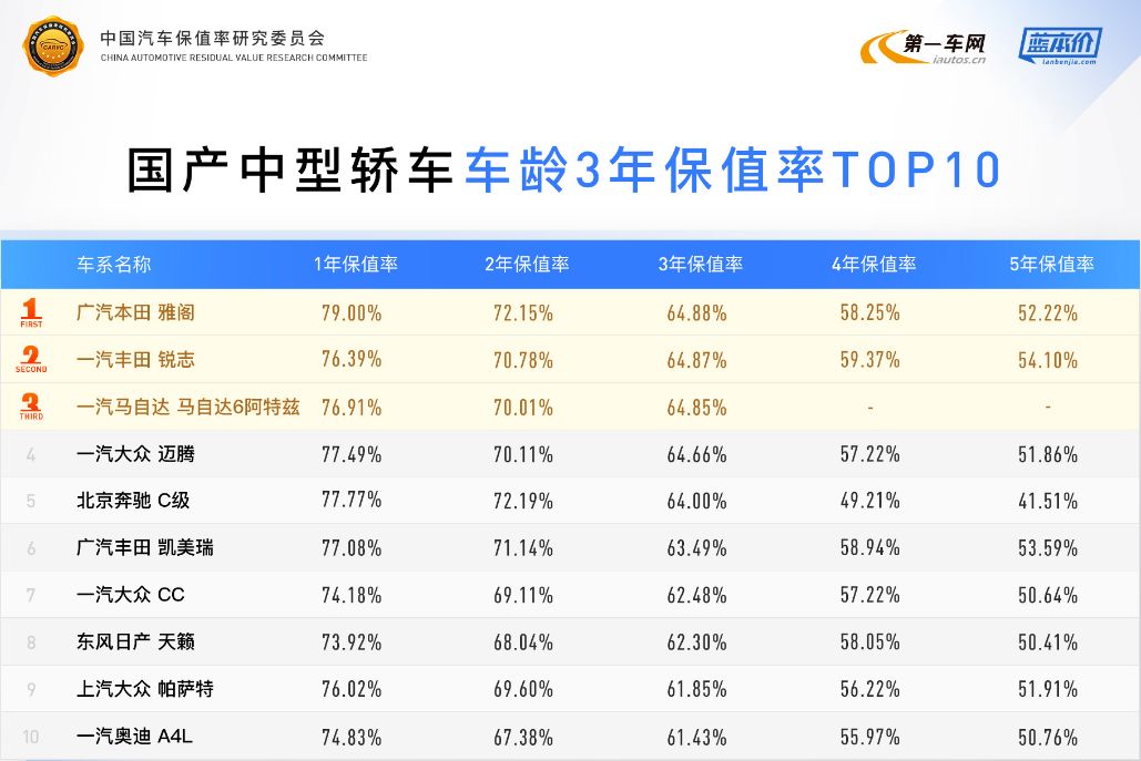 中级轿车依旧是德系和日系车平分秋色,国内中级轿车3年车龄保值率差异不大,市场竞争激烈,排名也会随时发生变化。