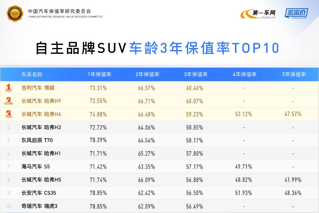 排名第三的H6系列是哈弗的主力车型,市场占有率高,保值率表现稳定。