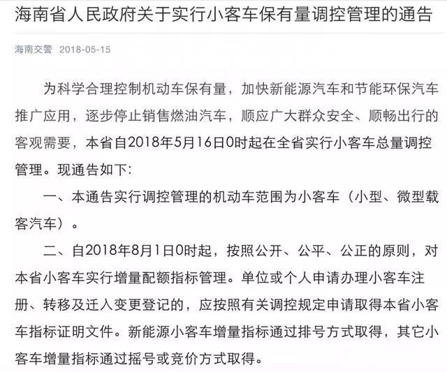 昨日,海南省人民政府发布《关于实行小客车保有量调控管理通告》,自2018年5月16日0时起,海南在全省实行小客车总量调控管理。今日起至7月31日24时,海南全省暂停受理小客车的注册登记、转移登记及迁入变更登记申请。