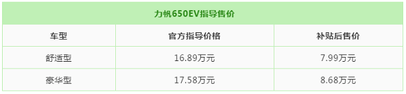 昨日重庆车展,力帆旗下纯电动紧凑型轿车力帆650EV正式上市,新车有两款车型,分别是舒适型和豪华型,售价分别为16.89万和17.58万,补贴后实际售价为7.99万和8.68万。