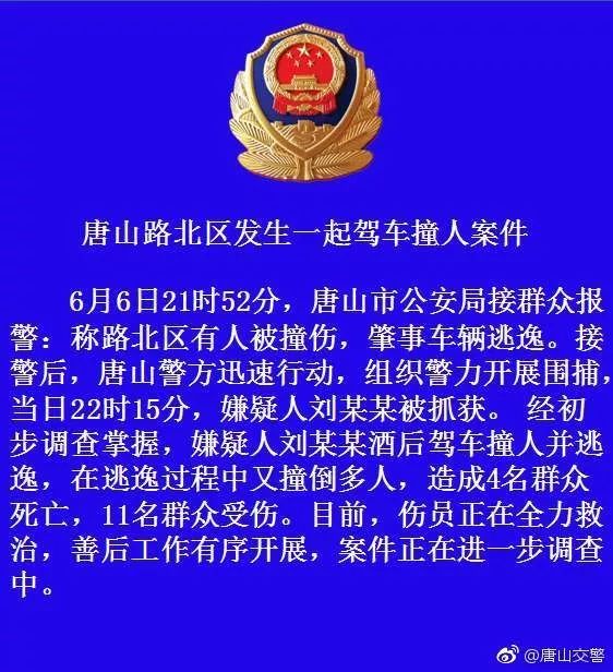 经警方初步调查掌握,嫌疑人刘某某酒后驾车撞人并逃逸,在逃逸过程中又撞倒多人,造成4名群众死亡,11名群众受伤。目前,伤员正在全力救治,善后工作有序开展,案件正在进一步调查中。