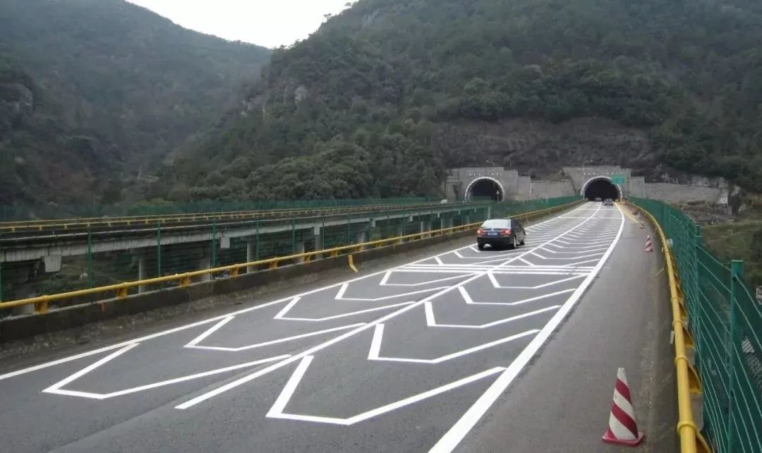 隧道口是高速公路经常发生交通事故的区域,在隧道口通常也会被放置一些限速标识,除了标识,交管部门在一些隧道出入口(隧道外200米到隧道内100米)也设置了错视觉标线(错视觉来源于这种标线会使人产生空间压缩的错觉),与限速标识一样,它的主要作用也是提醒进出隧道的驾驶员,一定要及时减速。