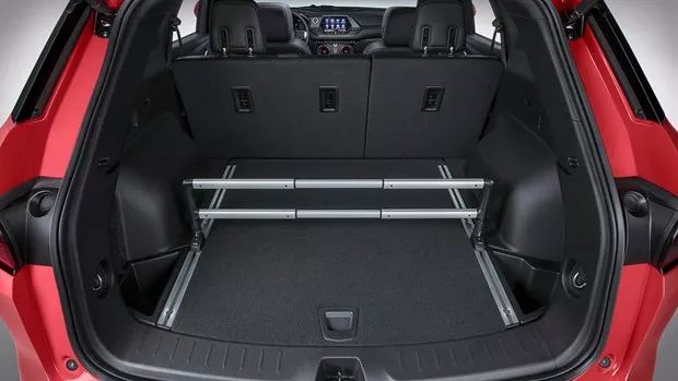 作为一款大空间的5座中型SUV,全新Blazer的后排座椅支持前后滑动调节和4/6比例分割放倒,放倒后的后备厢空间可扩展至1818升。与此同时,新车还配备了可前后滑动的后备厢隔断(图中银色横杆),提升了后备厢储物的稳定性。