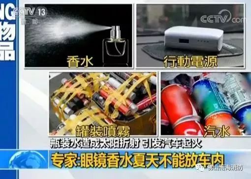 除了这种有像放大镜聚光效果的东西之外,香水,行动电源,罐装喷雾,汽车都会因为太阳照射后, 车内高温,容易自燃或是爆炸。常用东西,随手就丢在仪表板上,这个小动作虽然很方便,但却像是 个不定时炸弹,随时可能荷包大失血,甚至酿成火烧车意外。