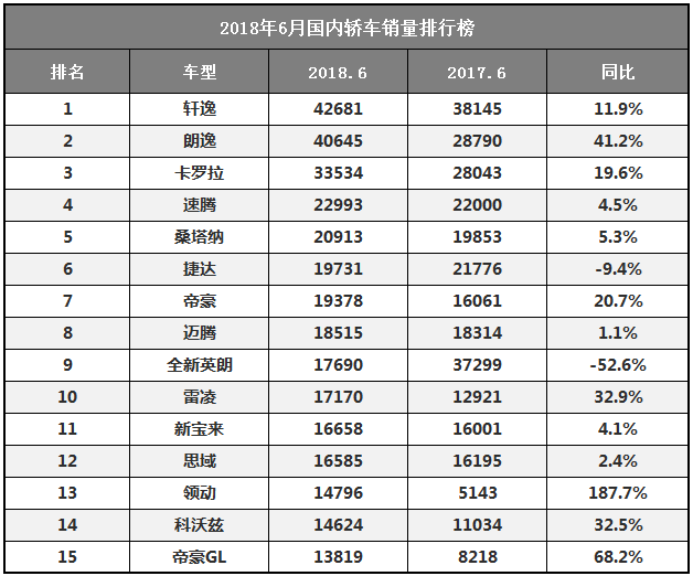 6月轿车销量排行榜,一款韩系车暴增长