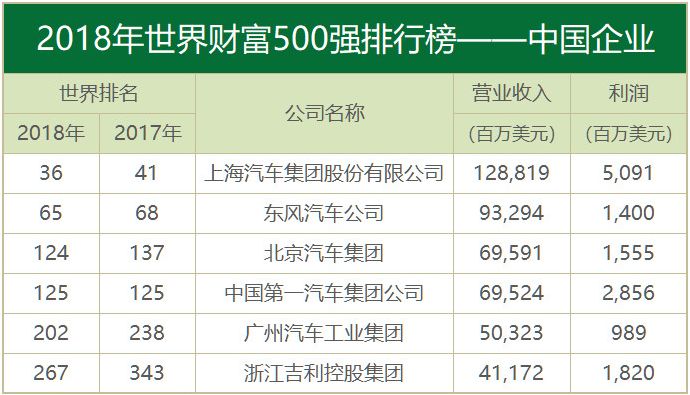世界500强榜单中,全球汽车企业有34席,中国有6家上榜公司,美国仅有通用汽车和福特两家。上榜的6家中国车企较去年排名大多有不同程度的提升。