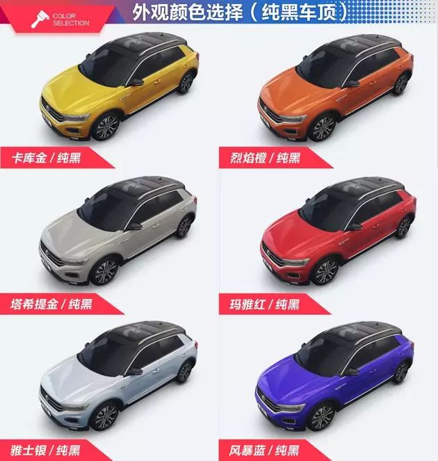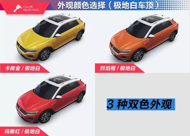 车身9种颜色分别为烈焰橙、卡库金、玛雅红、极地白、锰石黑、雅士银、砺石灰、塔希提金和风暴蓝;车顶3种颜色分别为纯黑、极地白和天际灰。不过。车顶颜色不能与车身颜色随意搭配。