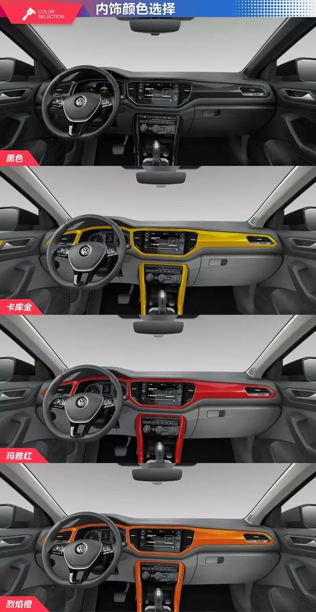 新车内饰造型基本维持了我们熟悉的大众家族的设计风格,看上去惊喜不多。不过新车通过多彩的颜色组合来摆脱中庸。新车提供3种彩色内饰以及3种彩色座椅配色可选。此外,其高配车型配备了全液晶仪表,营造出不错的科技感。