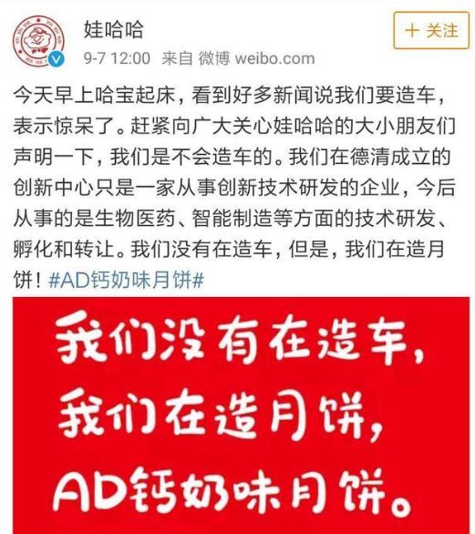 然而,正当大家准备好接受这个“事实”,脑补AD车系之际,娃哈哈终于出来澄清了,表示并不会造车,德清只是从事技术研发,专注生物医药、智能制造等方面。