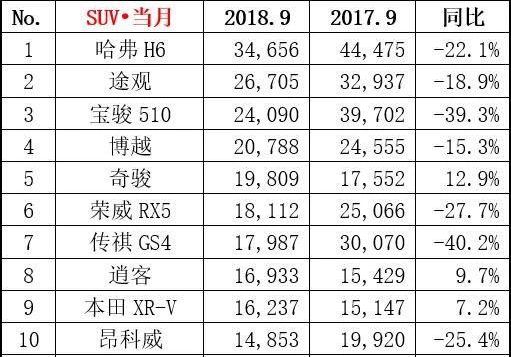 SUV几乎全线下跌,9月份SUV销量80.3万辆,同比大跌14.5%!哈弗H6虽然同比下跌了22.1%,仍位居第一位;传祺GS4、宝骏510、长安CS75等自主主力车型销量下滑明显,特别是传祺GS4,跌幅超过了40%。