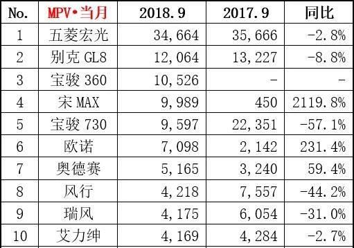 9月份MPV销量13.3万辆,同比大跌16.3%,前九个月累销123.2万辆,也有着12.5%的明显跌幅。宝骏730的销量下滑有些严重,同比下滑57.1%。宝骏360去年还没上市,因此没有对比数据,而宋MAX也只是去年9月底才上市,因此对比数据并没有太大的参考价值。