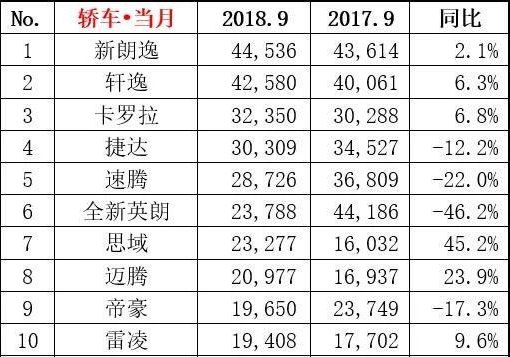 9月轿车总销量为96.9万辆,和去年同期相比下滑11.6%!从轿车销量前十榜单来看,销量有涨有跌,但是整体上还是下跌的,其中全新英朗跌幅最大,达到46.2%,比较亮眼的是思域,增长了45.2%。