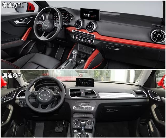 内饰方面,大家都保留了自己的家族设计。奥迪Q2L和Q3两者均保留了奥迪家族的经典设计,层次分明的“T”型布局搭配悬浮式触摸屏和三幅式方向盘,Q2L的出风口造型采用更为突出的旋涡状,中控更为简洁,双色搭配的效果更加运动潮酷,相比下奥迪Q3则是更加成熟的氛围。