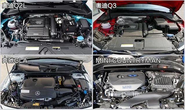 提及操控性,首先就得先说说动力,大家都知道小排量会是未来趋势,所以本次我们就以小排量作为对比参考,而且也显得更为公平。四款车中排量最小的是奥迪Q2L和Q3,EA211的1.4T发动机作为奥迪黄金动力,表现一点都不会弱,最大输出功率150Ps,最大输出扭矩250Nm。对比1.6T的奔驰GLA也就少了5Ps的马力,而且两者峰值扭矩相同。实际表现下来,Q2L百公里6.1L的油耗表现会比GLA的6.5L更为出色。而1.5T三缸的MINI COUNTRYMAN在动力表现上均处于劣势。