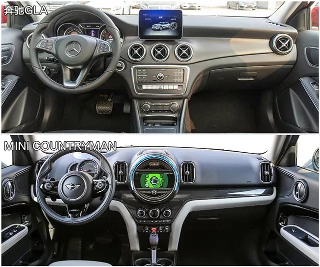 虽然奔驰GLA的内饰虽然布局也是很分明,不过整体感觉偏老,密密麻麻的数字按键会显得有点过时;而MINI COUNTRYMAN的内饰造型会和外观相呼应,圆形元素很多,不过并不是所有人都可以接受的类型。