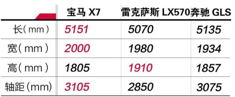 既然称为史上最大的宝马,在车身尺寸方面,自然成为了一大关注热点。其长宽高分别为5151/2000/1805mm,轴距为3105mm。在于同级别的比较中,除了高度方面略逊于雷克萨斯LX570,其余参数均大于对手。