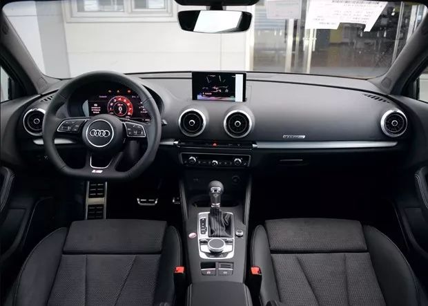 奥迪S3内饰延续了奥迪S系列的特点,不做夸张的调整,只在与驾驶员有关的部位。S3更换了更适合驾驶的元素,例如更小尺寸的方向盘,摩擦力更好的座椅,以及一些如金属踏板等辅助原件。此外用户还可选择S系列专属运动座椅以及红黑双色高档纳帕真皮材质。