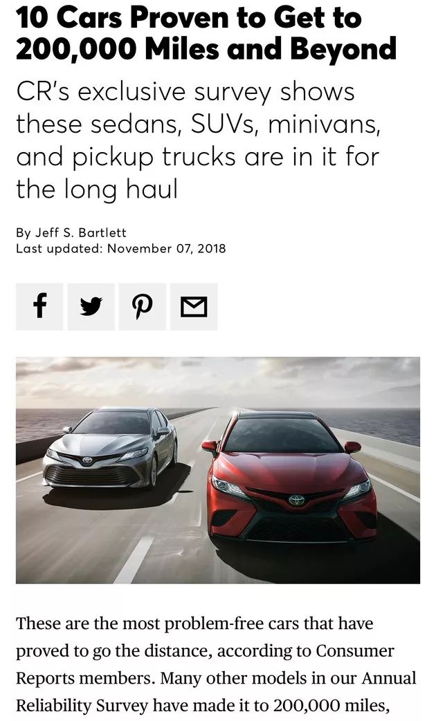 美国的《消费者报告》杂志每年都会通过数据收集评选出可靠性最佳的车型,这次《消费者报告》公布了一批行驶里程超20万英里(约32万公里)并且没有大修的车型,这份报告是由美国的中立机构提供,还是具有一定的参考价值的。