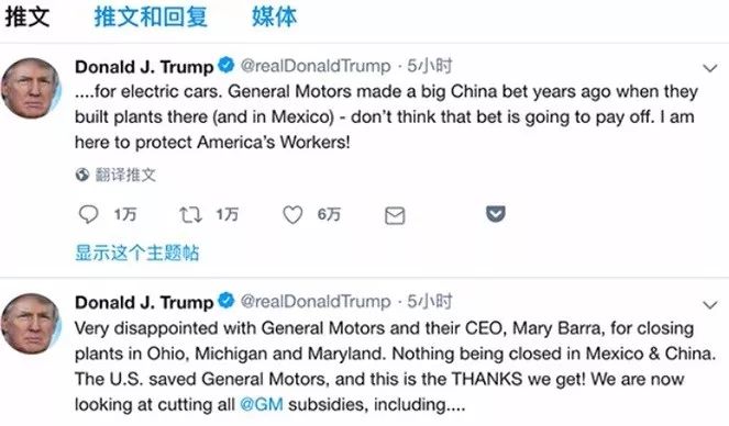 随后特朗普在推特上说道:“通用公司没有关闭在墨西哥或中国的工厂,却要关闭美国(本土)工厂。美国拯救了通用,但这就是我们得到的感谢!我们正在考虑取消对通用汽车的所有补贴,包括电动汽车(补贴)。”特朗普发布推文后,通用汽车股价下跌了2.4%,对此,通用公司拒绝置评。