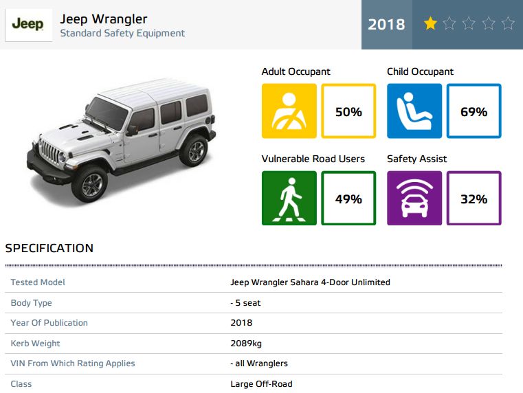 根据测试报告的数据,JEEP牧马人得分低的原因主要有两点;一是因为缺乏主动安全配置,要知道E-NCAP的测试中对主动安全配置的测试早已成为必修课,而牧马人在安全辅助系统单项中仅获得32%的评分。