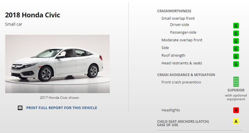 IIHS指出,有17款车型因为前大灯仅获得“可接受(acceptable)”等级而错失TSP+榜单,其中包括本田雅阁、日产天籁、丰田卡罗拉以及三菱欧蓝德。有研究发现,很多大灯夜间的功能不如预期并且会影响迎面司机的视线,因此IIHS于2016年开始将大灯功能纳入标准。