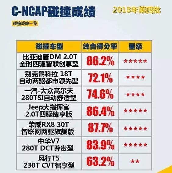 日前,2018年度C-NCAP第四批碰撞试验成绩正式对外公布。参加本次碰撞试验的共有7款车型,分别为:比亚迪唐DM、别克昂科拉、大众高尔夫、Jeep大指挥官、荣威RX8、中华V7、东风风行T5,其中四款车型获得了五星级成绩。