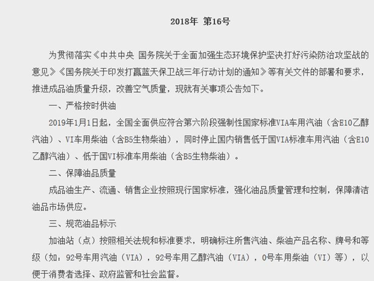 日前,国家发展改革委官网公开发布了第16号文件。该文件指出,自2019年1月1日起,全国全面供应符合第六阶段强制性国家标准VIA车用汽油(含E10乙醇汽油)、VI车用柴油(含B5生物柴油),同时停止国内销售低于国VIA标准车用汽油(含E10乙醇汽油)、低于国VI标准车用柴油(含B5生物柴油)。