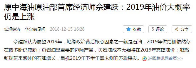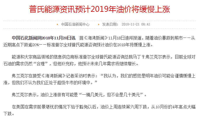 中石油:对于新一年的油价预测,中石油的态度相对保守,只在自家官网中国石油新闻中心上转载了一篇“普氏能源资讯预计2019年油价将缓慢上涨”的文章。
