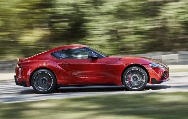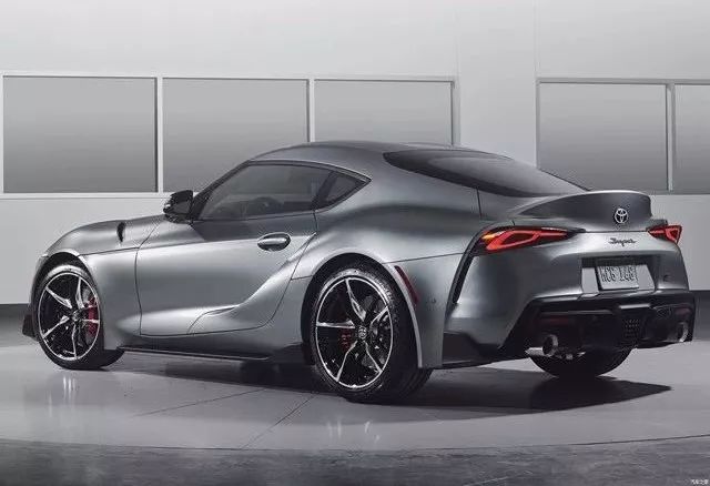 车身侧面,全新丰田Supra拥有较为修长的车头,座舱位置整体靠后,再搭配较为短促的车尾,新车的车身比例显得富有运动感。新车采用标准跑车的前置后驱(FR)长机舱短后悬设计,在车身比例上能获得50:50的黄金比例。