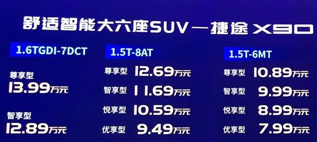 2019年1月13日,奇瑞控股捷途旗下全新SUV车型——捷途X90正式上市,新车推出不同配置10款车型,官方指导售价区间为7.99-13.99万元。该车属中型SUV,提供5座、6座(主推)和5+2座可选。