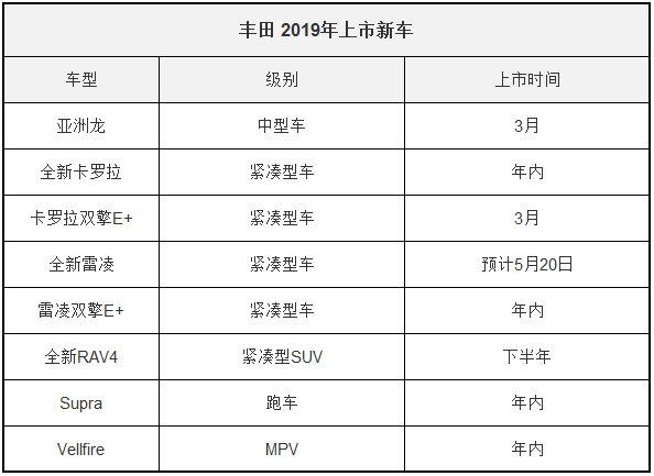 2018年,丰田在中国市场卖出了147万辆新车,同比增长14.3%,在车市颓靡不振的环境下难得可贵。而新的一年,丰田并没有停下脚步,相继推出亚洲龙、全新卡罗拉/雷凌、全新RAV4等八款全新车型,其中还包括两款平民跑车。