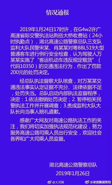 27日凌晨,湖北高速交警官方微博 @湖北高速交警 就此事发布警情通报,决定:依法撤销处罚决定、暂停相关民警执法工作并开展调查、责成监利大队大队长向当事人赔礼道歉。