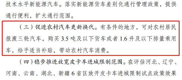 根据十部委引发的通知,促进农村汽车更新换代主要体现在:有条件的地方,可对农村居民 报废三轮汽车,购买 3.5 吨及以下货车或者 1.6 升及以下排量乘用车,给予适当补贴,带动农村汽车消费。