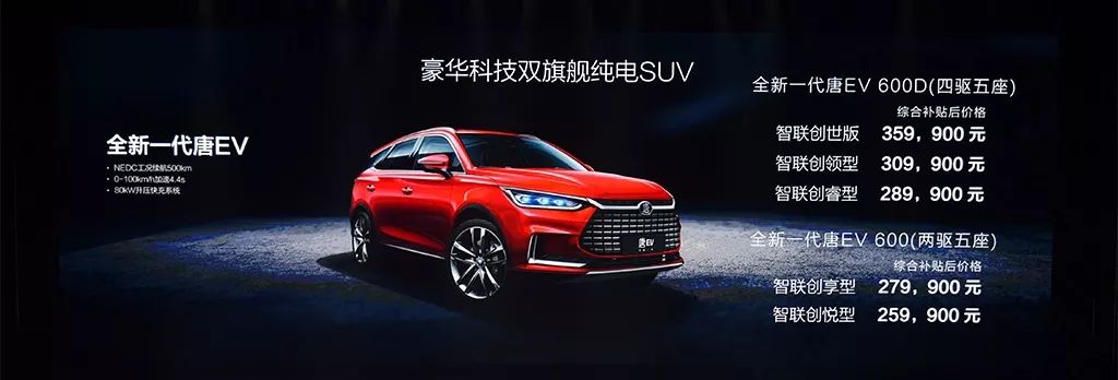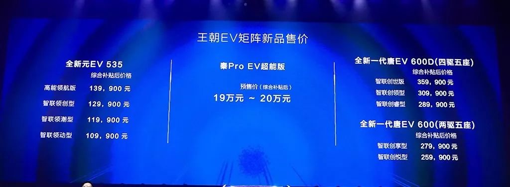 其中,元EV 535补贴后售价为10.99万元—13.99万元,秦Pro EV只公布了预售价,补贴过后售价为19万元—20万元之间,唐EV系列则公布了两款五座车型,分别是两驱版的唐EV 600,补贴后售价25.99万元—27.99万元,四驱版的唐EV 600D补贴后售价28.99万元—35.99万元。