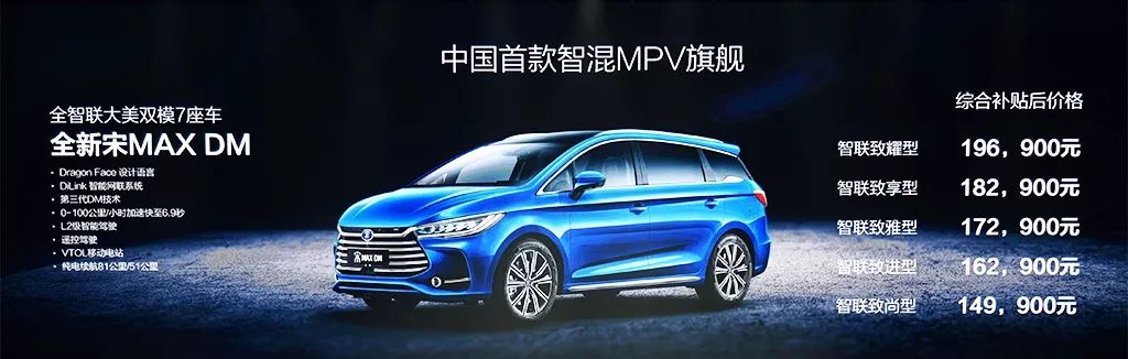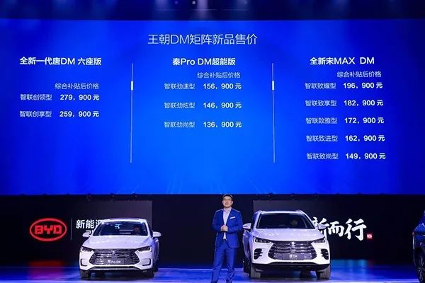 其中秦Pro DM版补贴后售价为13.69万元—15.69万元,全新上市的宋Max DM版本补贴后售价为14.99万元—19.69万元,唐 DM六座版补贴后售价为25.99万元—27.99万元。