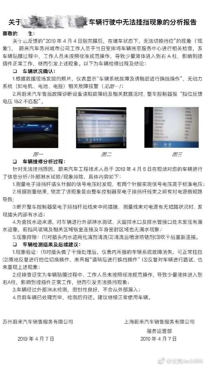 后来,蔚来官方给车主发回了一份分析报告,表示已经查明车子出现故障的原因。报告中显示,这次的故障是由于贴膜时操作不规范,导致液体进入右侧A柱导致电路故障,在排除了故障以后,建议车主继续正常使用汽车。这样奇葩的“原因”多多少少有点出乎意料。