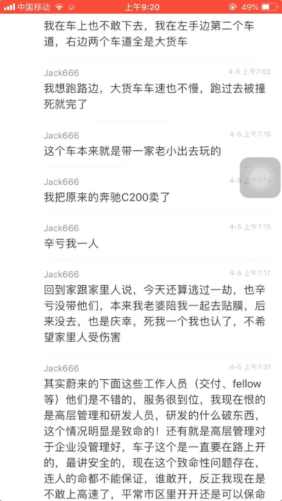 根据车主提供的聊天记录可以看到,但是车子正行驶在高速上,突然出现动力故障,重启系统也无法恢复正常,最后只能呼叫官方救援。由于事发突然,又是在高速路上,这也让车主惊出一身冷汗,直言是自己“命大”,如果当时不是车流缓慢,很有可能就发生严重事故了。