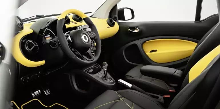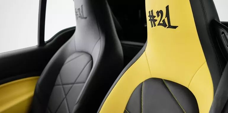 当然,除了骚气的外表,作为一个很“会玩”的品牌,这款Smart限量版车型的内饰同样充满惊喜,正副驾驶两张椅子分别使用了两种颜色的真皮,正好与车身颜色相呼应,随处可见#21 标志时刻提醒着人们这不是一台普通的Smart。
